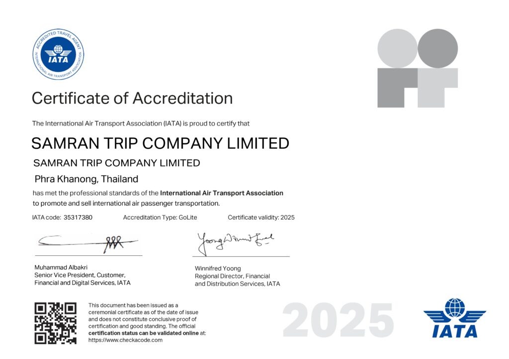 บริษัท สำราญทริป จำกัด ได้รับการรับรองจาก International Air Transport Association (IATA) ในการดำเนินการจองและจำหน่ายตั๋วเครื่องบินทั้งภายในประเทศและต่างประเทศ